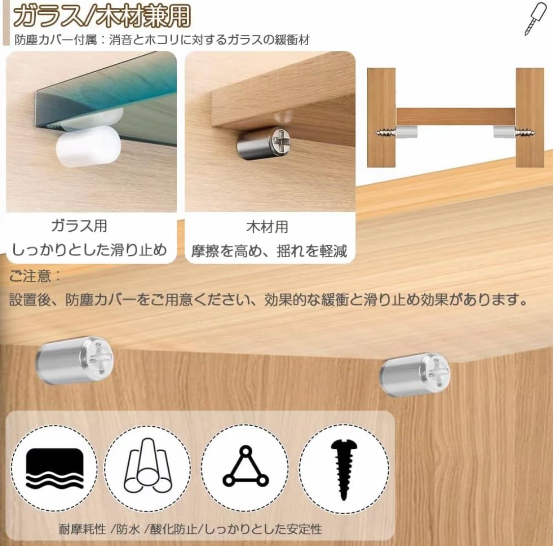 防塵ゴムスリ一ブ付き:この棚ダボには、消音と木コリ除けのガラスクッションの役割を果たすキャップが付属しているので、キャップを取り付ければ棚板が滑ったり動いたりするのを防ぐことができます。