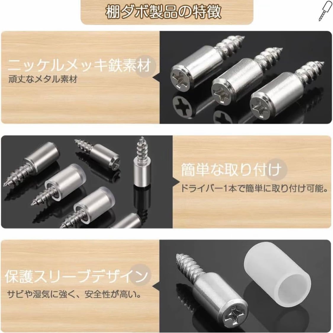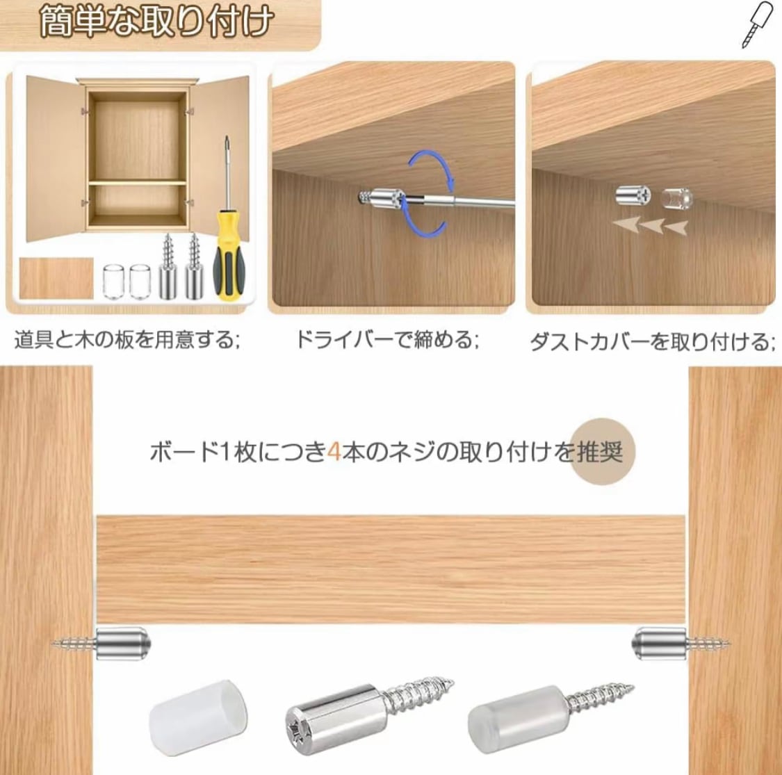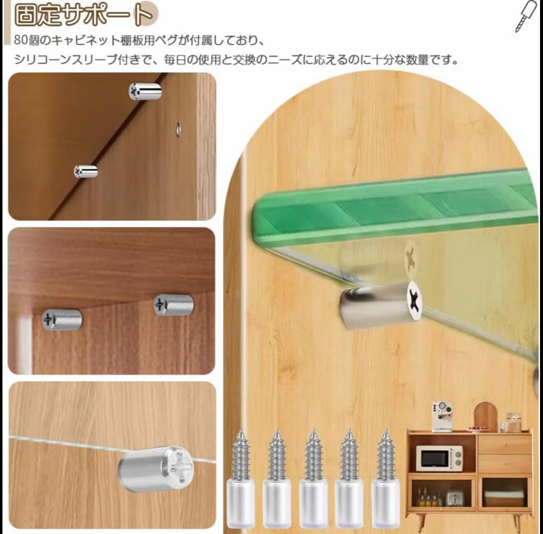 セット内容:棚ダボ80枚セット;棚受けダボサイズ:26*7.5mm;保護力バ一:9*15mm;80個のキャビネッ卜棚板用ペグが付属しており、シリコーンスリーブ付きで、毎日の使用と交換の二一ズに応えるのに十分な数量です。取り付け簡単:電動ドリル不要。ドライバ一(別壳)でねじ込むだけで、簡単に取り付け、取り外しができます。シリコンの滑り止めスリーブ付きで、滑りにくく、傷や騒音を軽減します。