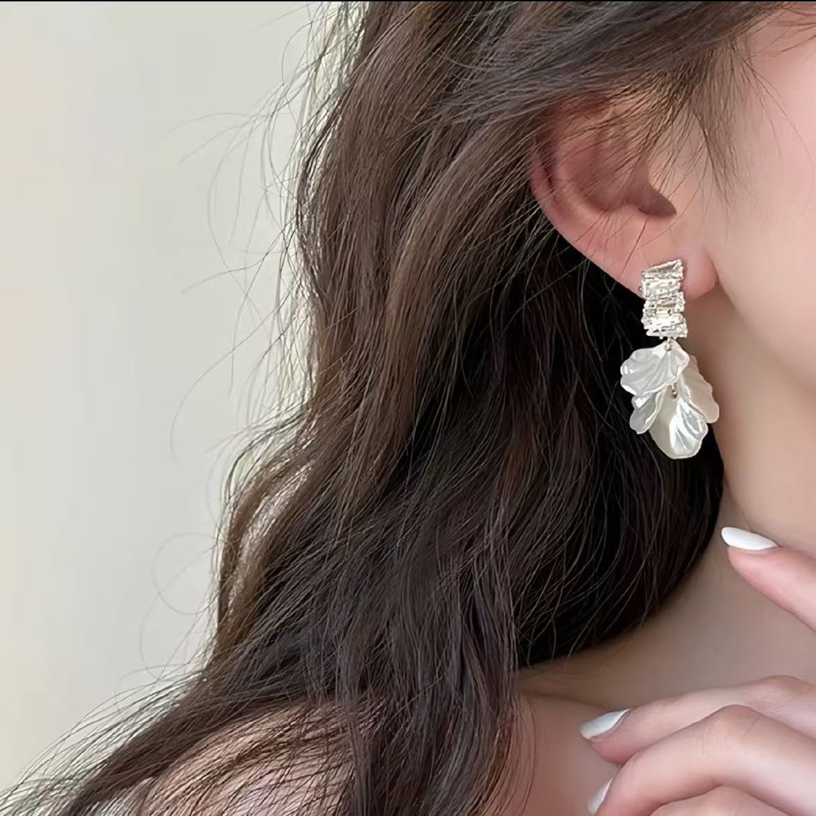 貝殻と花びらをモチーフにしたデザインは、女性らしさを引き立て、可憐な印象を与えます。パール調の輝きが耳元を華やかに彩り、フォーマルな場でも活躍します。特別な日のコーディネートにもぴったりです。