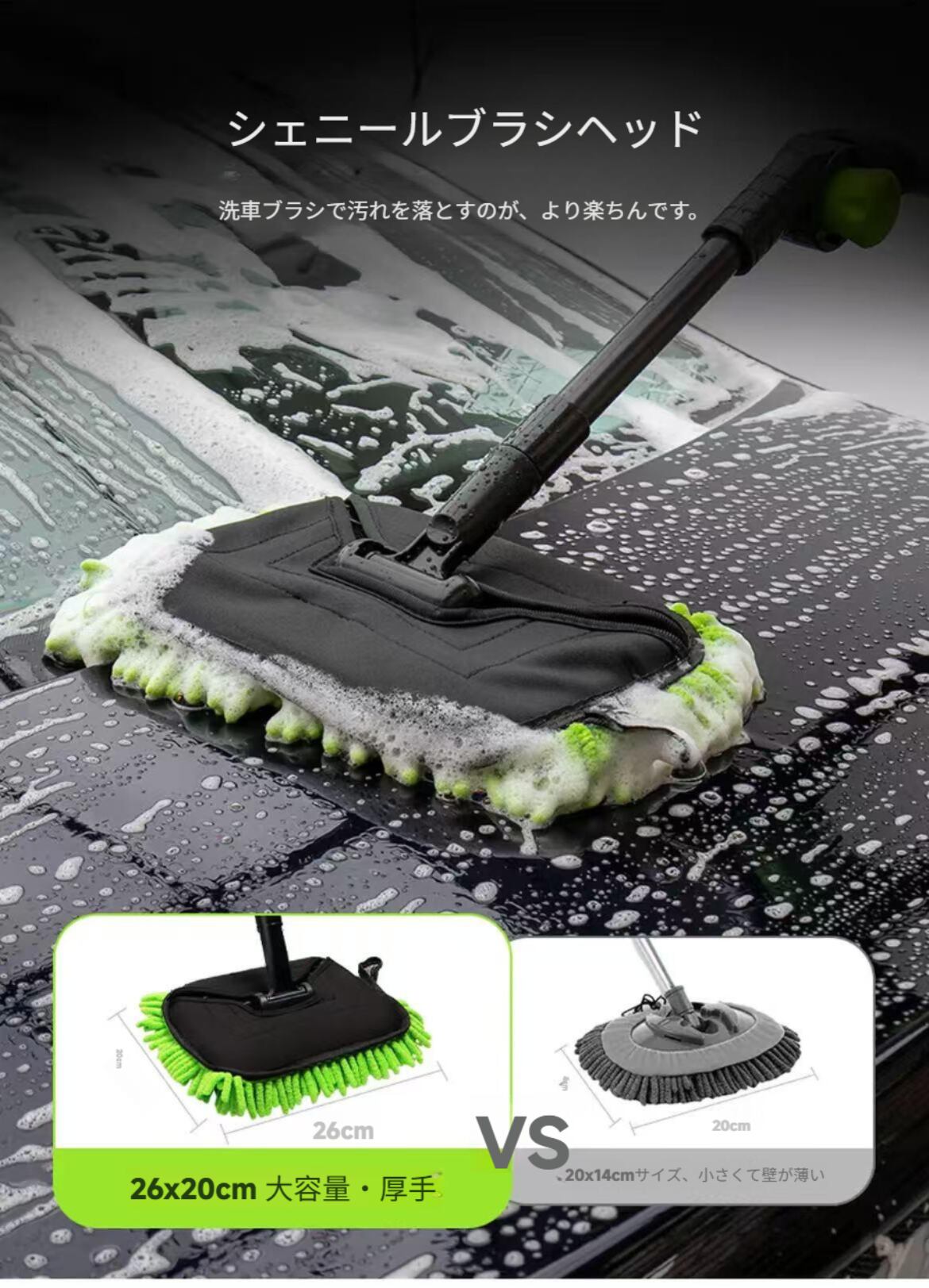 この洗車ブラシは180度曲がるアームを採用しているため、車の曲面や隙間にもスムーズにフィットします。手が届きにくい箇所も楽に洗浄できるので、洗車の効率を格段に向上させます。