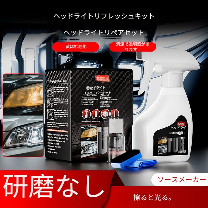 「ヘッドライト リニューアルキット」は、そんなお悩みを完全解決する画期的なプロ仕様のセットです。最大の特長は、面倒なサンドペーパーがけ(研磨)を必要としない「ノーグラインド処方」。従来のリペアでは難しかった、複雑な曲面のライトも、専用のクリーナーで丁寧に洗浄後、黄ばみ除去成分を配合した「リペア液」を塗布するだけで、内部からくもりを浮き上がらせ、奥に溜まった汚れを分解します。