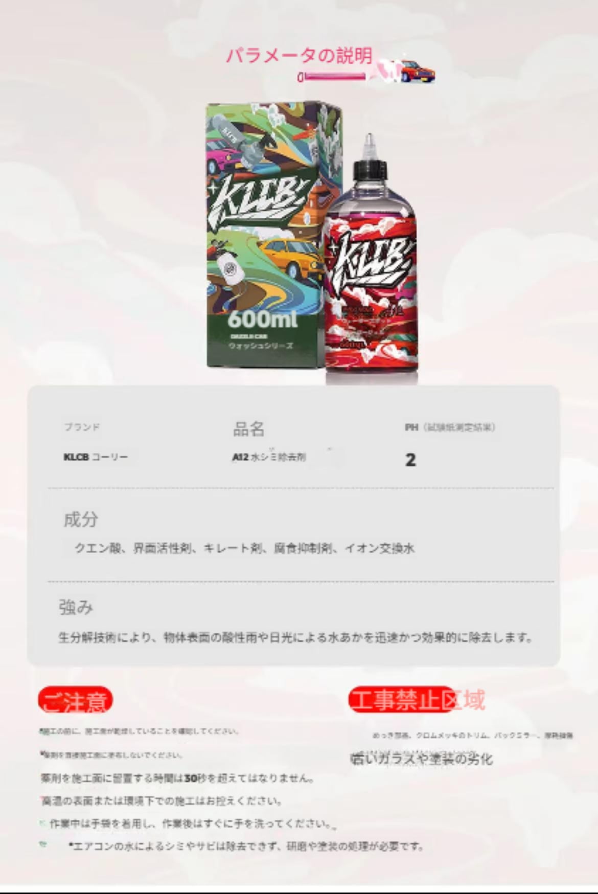 安全中性:強い酸やアルカリを使用していないため、塗装やラバー、プラスチック部材を劣化させず、安心してご使用いただけます。