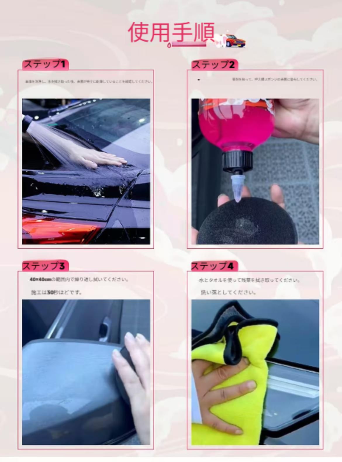 ※必ずスポンジ等に取って使用し、原液を直接車体に垂らさないでください。