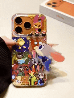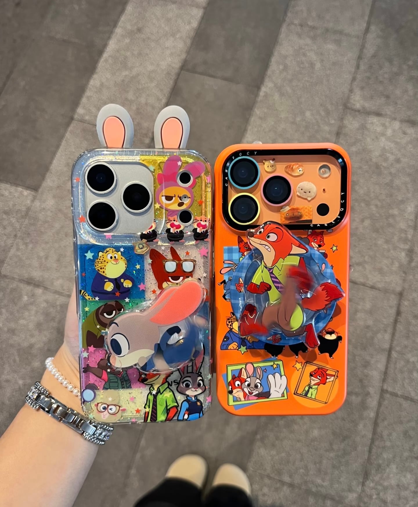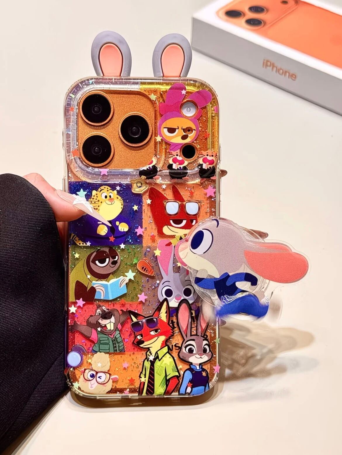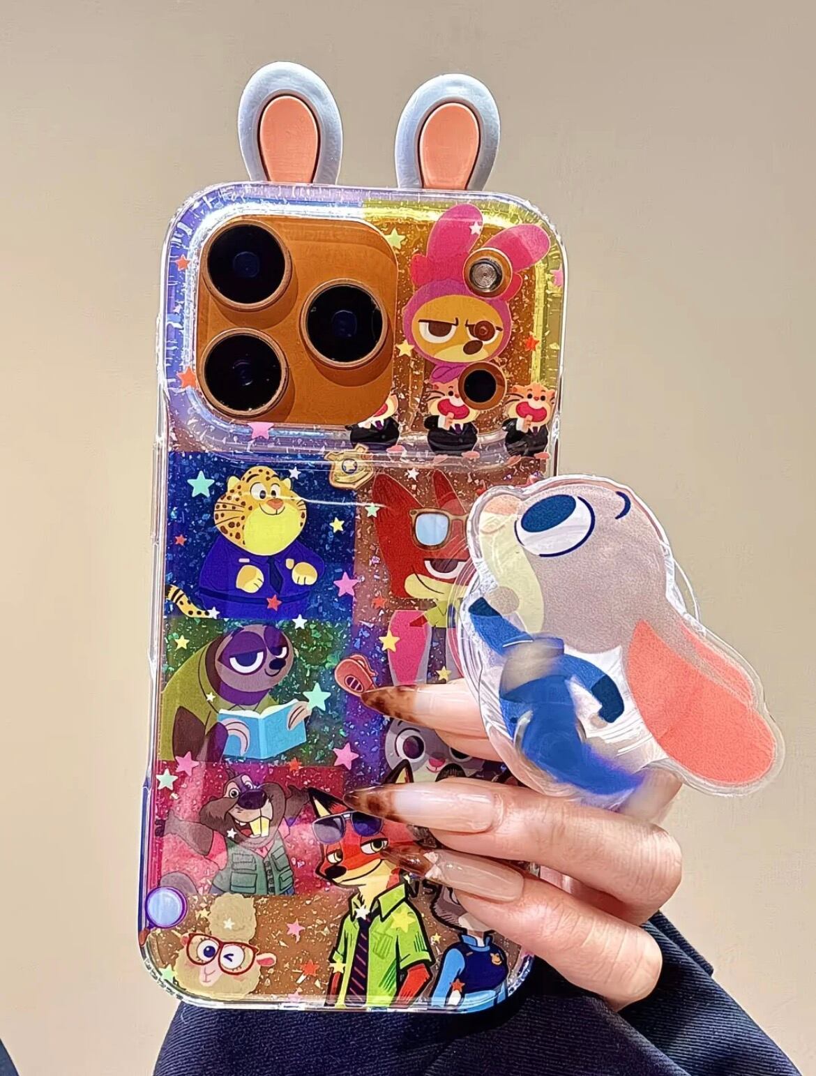 《YU05》【iPhone17ProMax/16/15/14/13対応】宮格カートゥーン・アニマルポリス ディズニー スタンドカバー 立体耳&回転スタンド付き キラキララメ