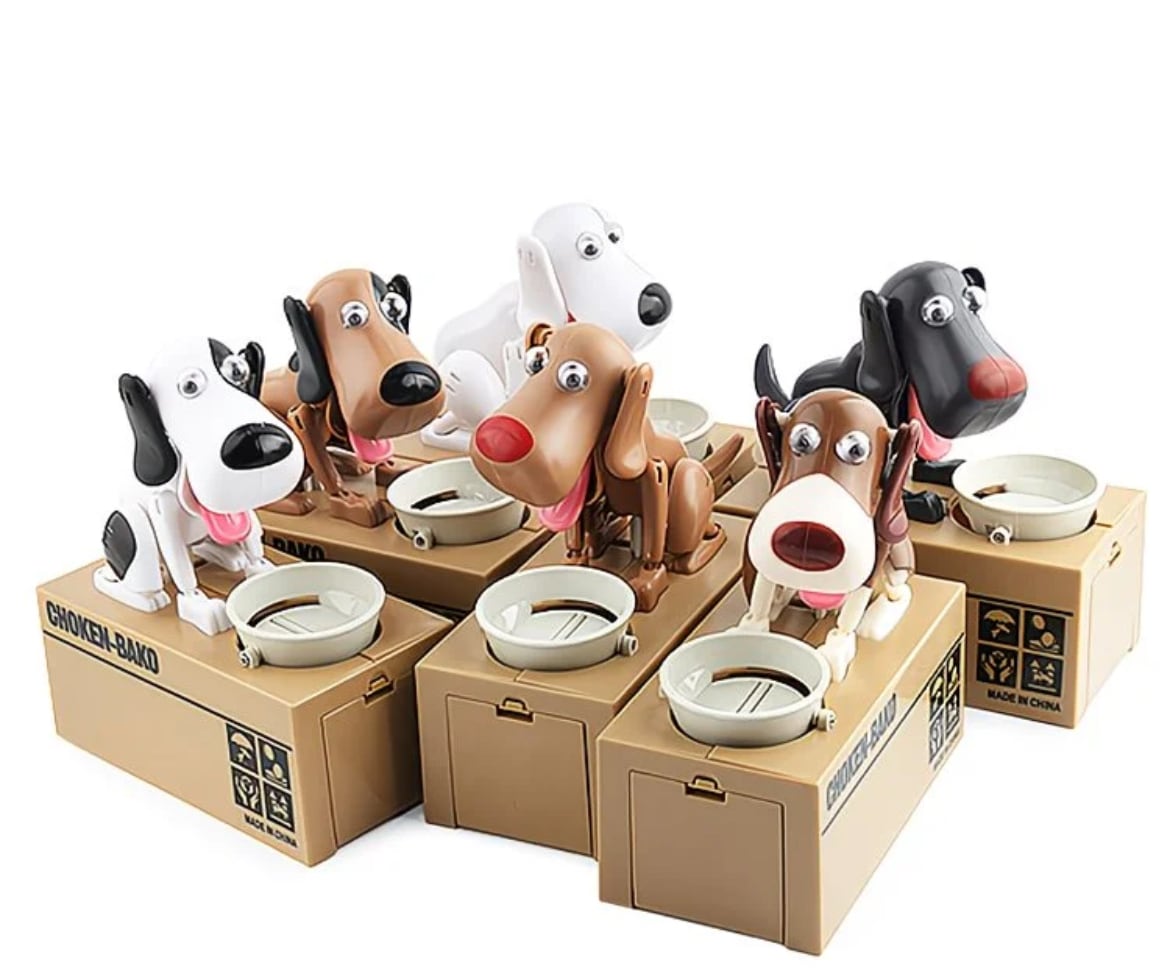 ユニークな自動仕掛け: エサ皿にコインを置くだけでスイッチON!わんこが一生懸命にエサ(コイン)を食べる仕草をして、下の貯金スペースにコインが滑り落ちます。