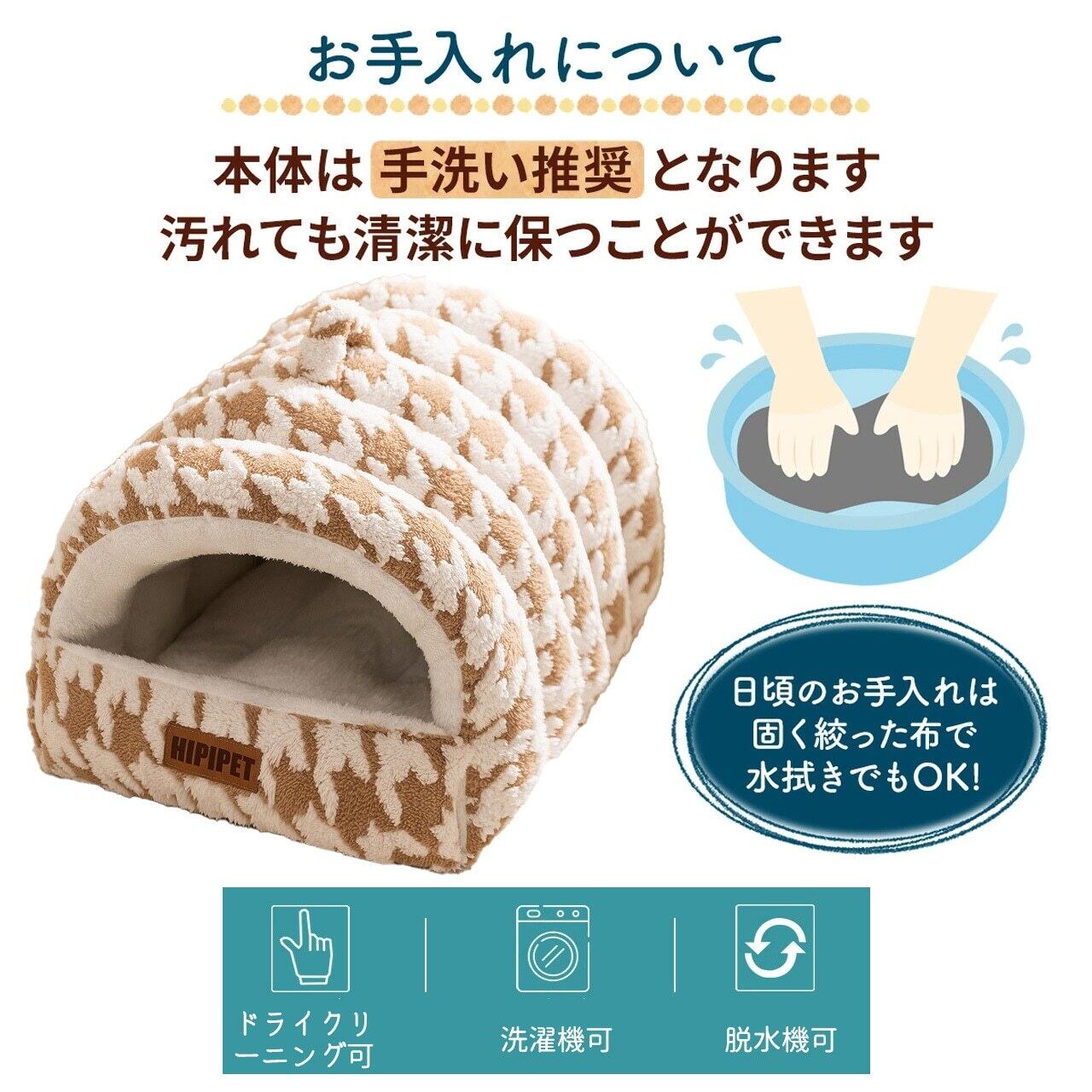 お手入れも簡単なのが嬉しいポイント!このペットハウスは丸洗い可能で、常に清潔な状態を保てます。ペットが使う場所だからこそ、清掃がしやすい設計になっているのは大きな魅力です。