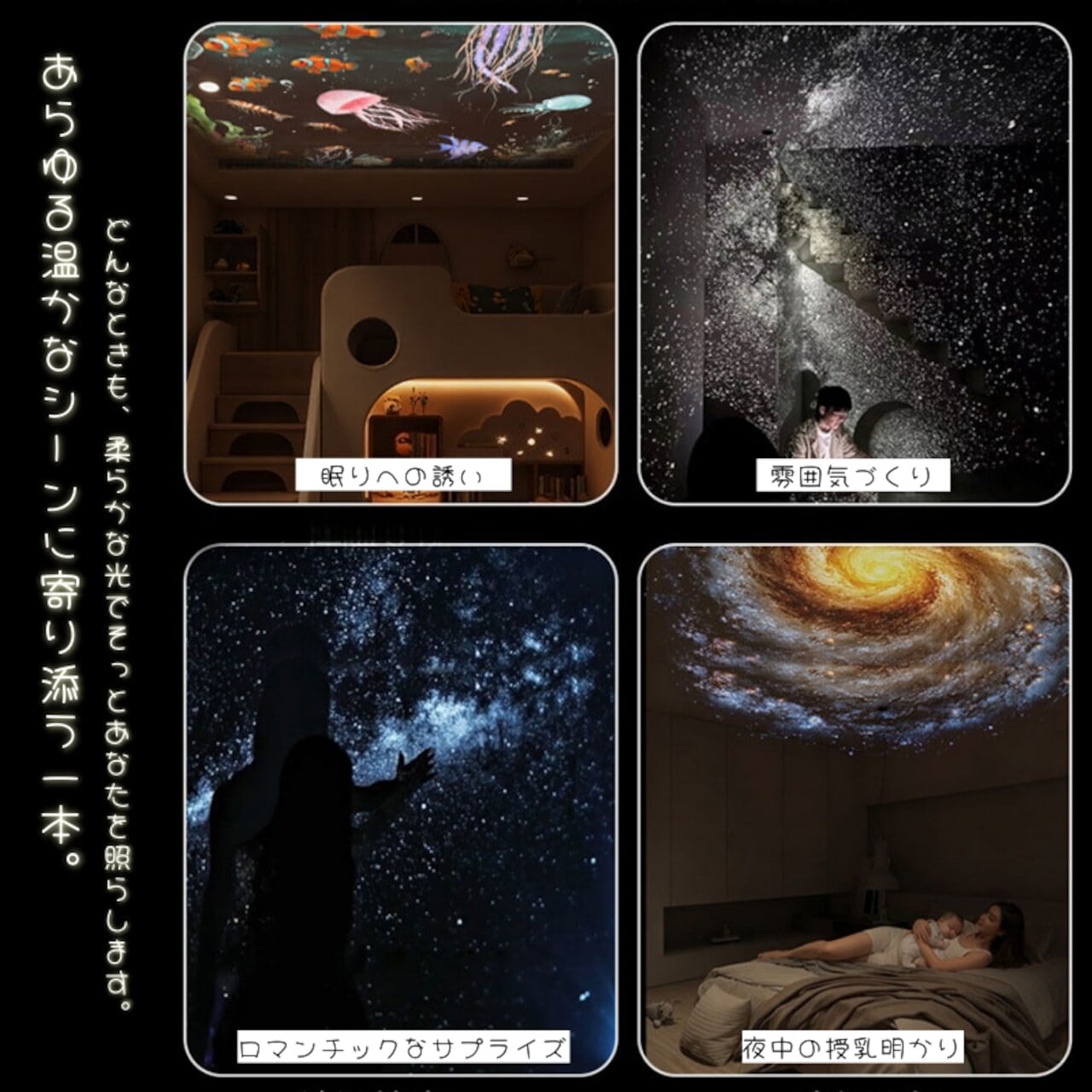 就寝時の安心灯りとして、お子様の寝かしつけや夜中の授乳はもちろん、大人のリラックスタイムやムーディーな空間作りにもぴったり。