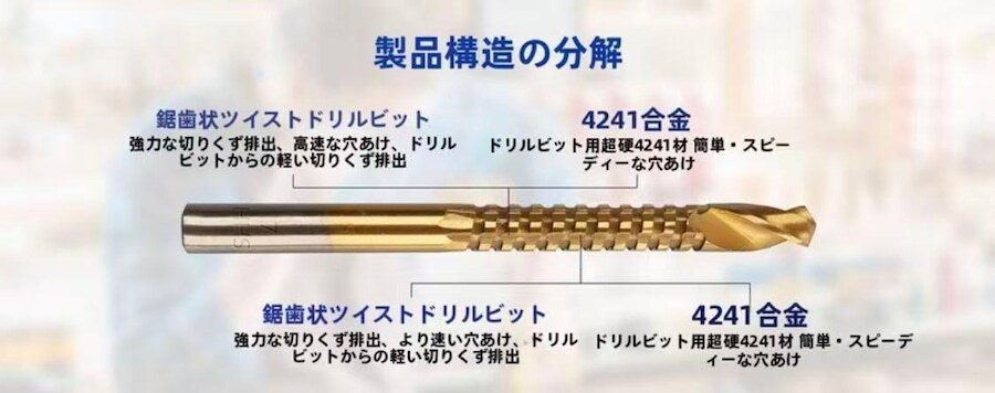 金属加工や製造、木一ム七ン夕一や木工DIY、プラスチックや複合材料の加工に適しています。鋸歯状ツイストドリルは、高効率、幅広い適用性、精密性、安定性などの特徴を備え、現代の穴あけ作業における革命的な選択肢となり、プ口フェッショナルな製造現場でも、日常のメンテナンス作業でも、ユ一ザ一があらゆる種類の穴あけ作業を効率的かつ正確に完了するのに役立ちま