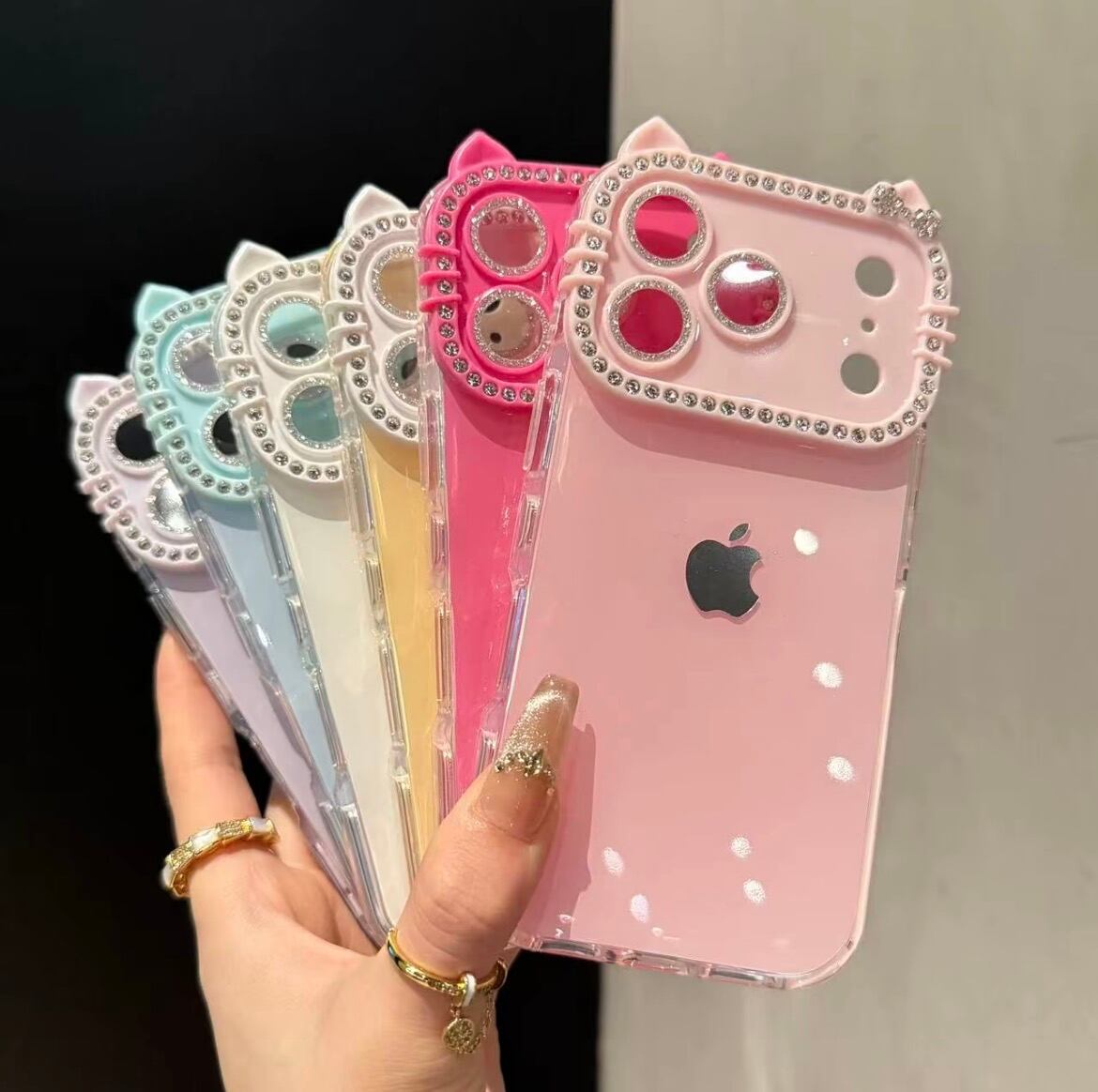 《YU06》可愛すぎる!猫耳付き キラキラビジュー エアクッションケース iPhone17/16/15対応