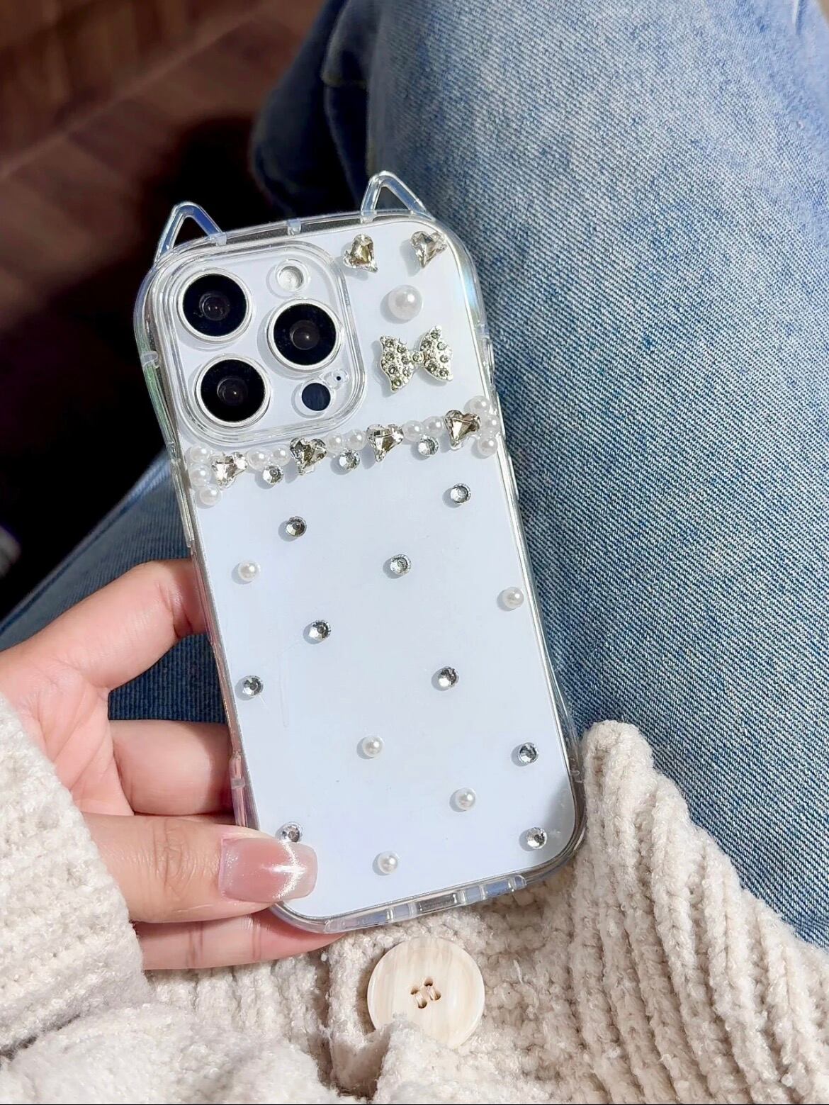 大人気の猫耳デザインに、キラキラ輝くビジューをたっぷり敷き詰めた、華やかで可愛いiPhoneケースです。