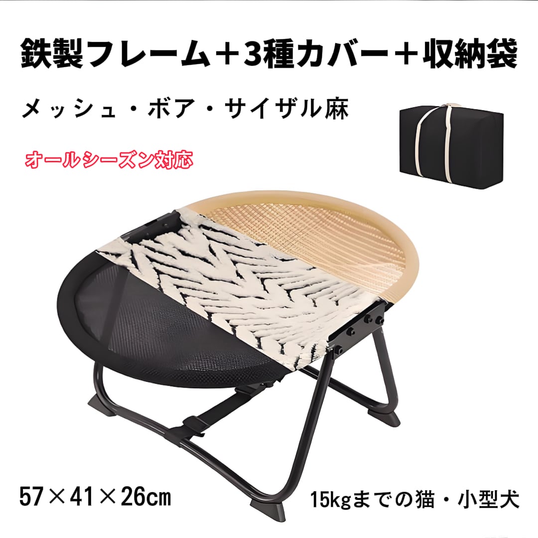 愛犬・愛猫のための快適な高床式ペットコットです。メッシュ素材を使用した通気性抜群の設計で、夏は涼しく、冬はマットを敷けば暖かく、オールシーズン快適にお使いいただけます。
