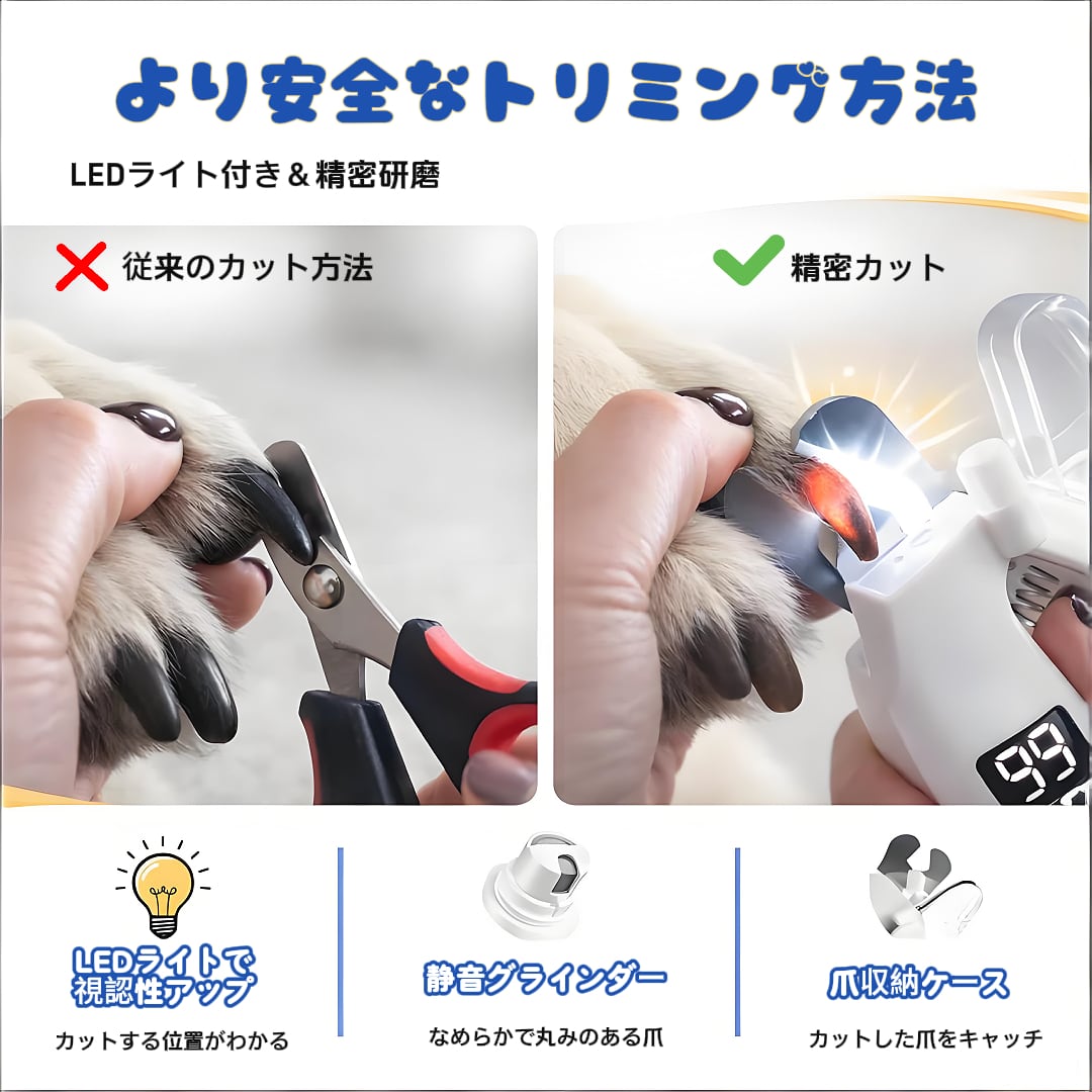 可愛い愛犬や愛猫の爪のお手入れを、もっと安心で簡単に行える商品が登場しました!【もう怖くない】LEDライト付きのペット用爪切りは、血管が透けて見える特別な設計で、切りすぎの心配を解消します。コンパクトな作りで収納も便利なので、いつでもどこでもお手入れが可能です。